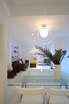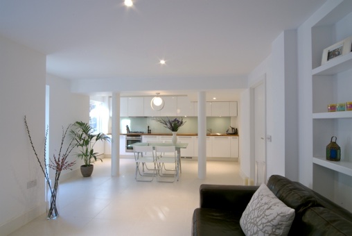 The brief for this two storey flat in Oakley Square required ‘light’ especially to the lower ground floor basement area which had very low headroom and had been divided up into small unusable spaces. Structural works were undertaken to remove the spine wall and two steel columns inserted to open the space up and provide the template for a light and airy space.